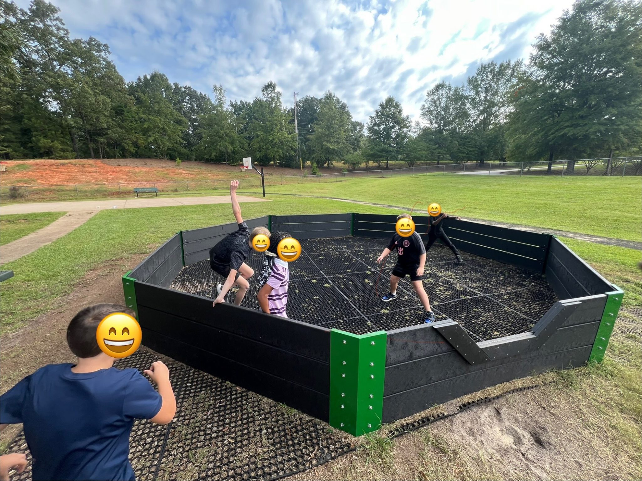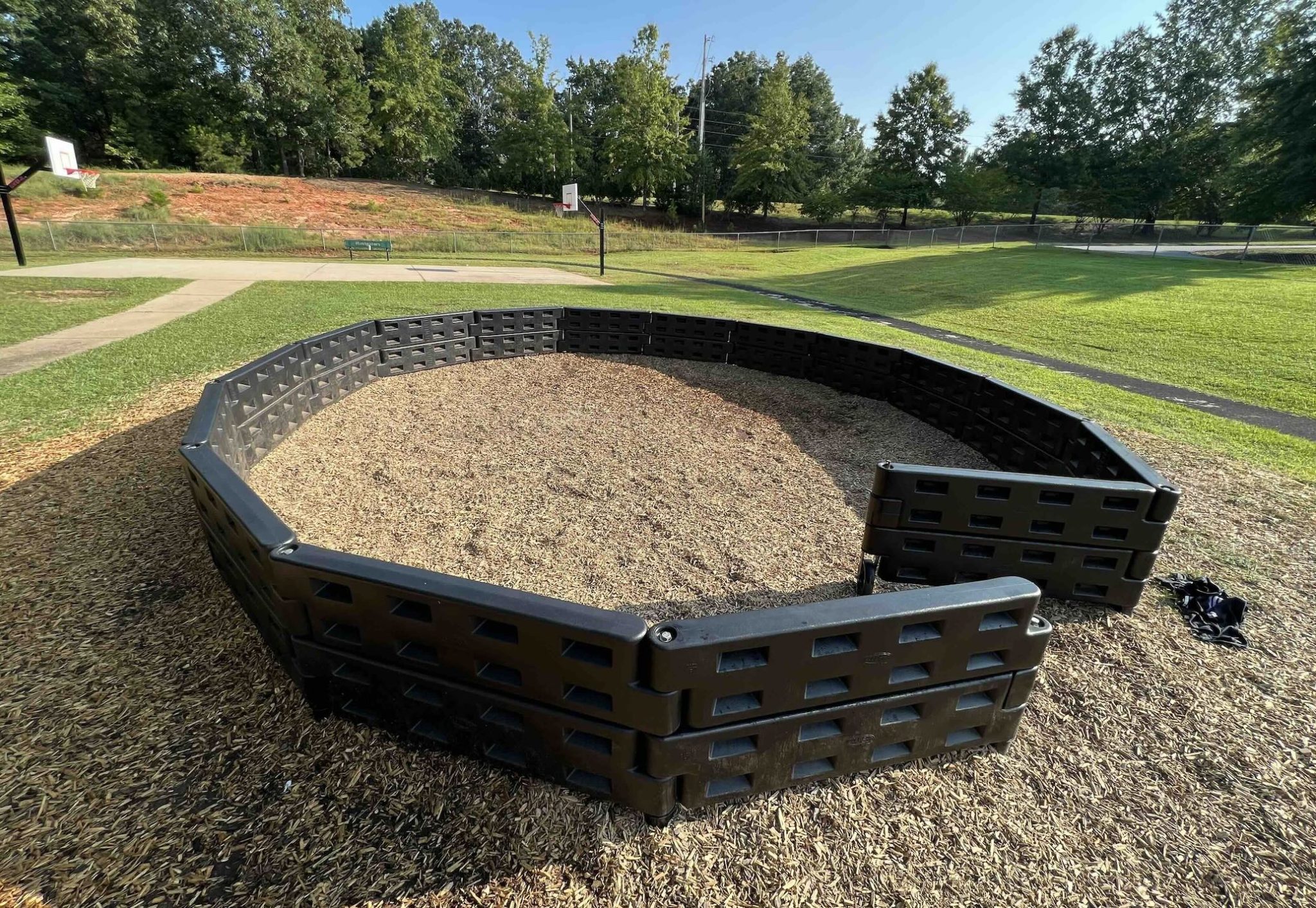 Our school went with a cheaper pit which replaced some older playground equipment (the swings which unfortunately have been outlawed for being unsafe 😭). The area already had a mulch area so they just installed it over the mulch (see below)