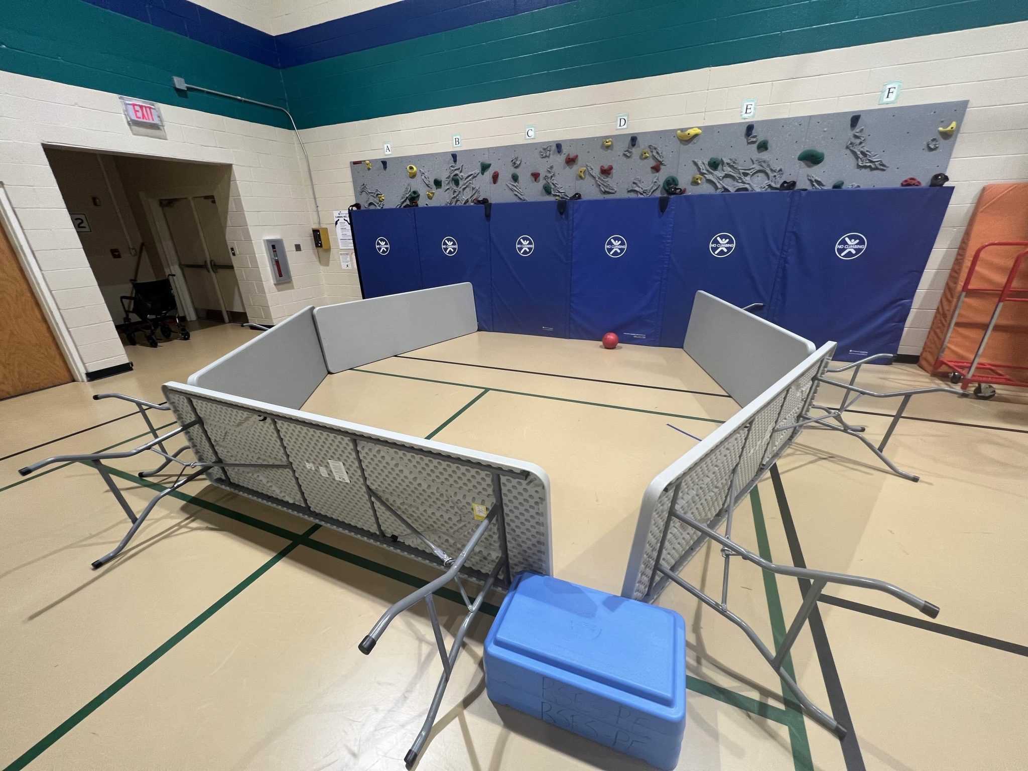 I use 8 ft folding tables to create 2 Gaga Pits for one class of 25ish kiddos (if I had double classes of 50-60 I would do 3-4 pits instead of 2 if I had the tables available or work it in as a station activity)
